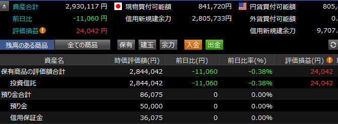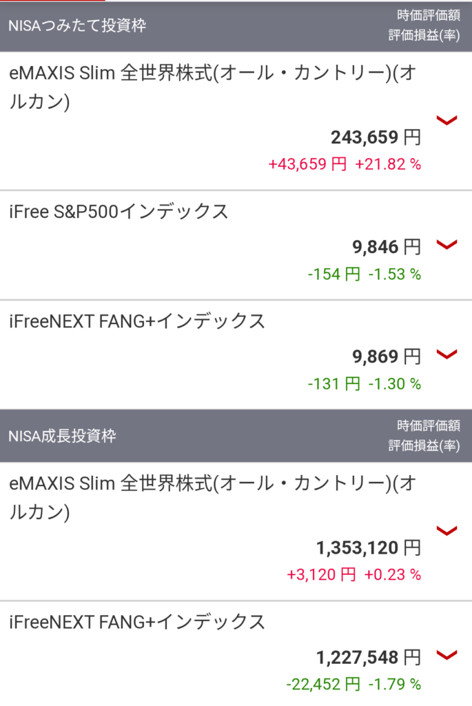 | 成長投資枠FANG+ | 1,227,548円 | 1,158,722円 | +68,826円 |