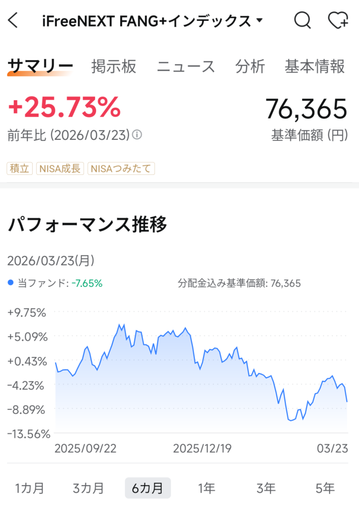| 成長投資枠FANG+ | 1,176,861円 | −73,139円 | −5.85% |