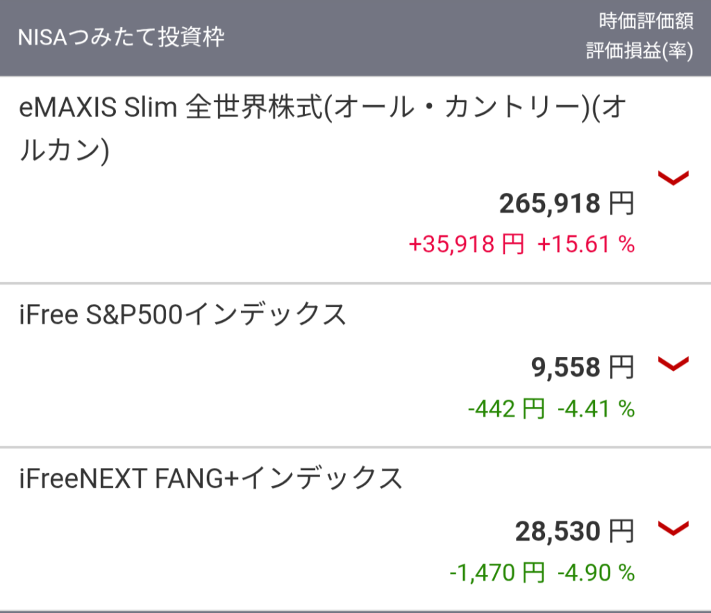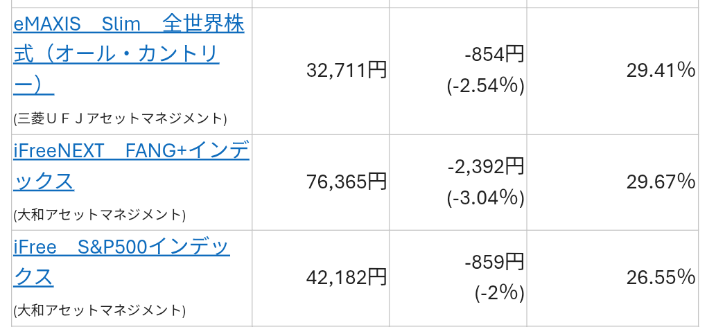 | 積立FANG+ | 28,530円 | −1,470円 | −4.90% |