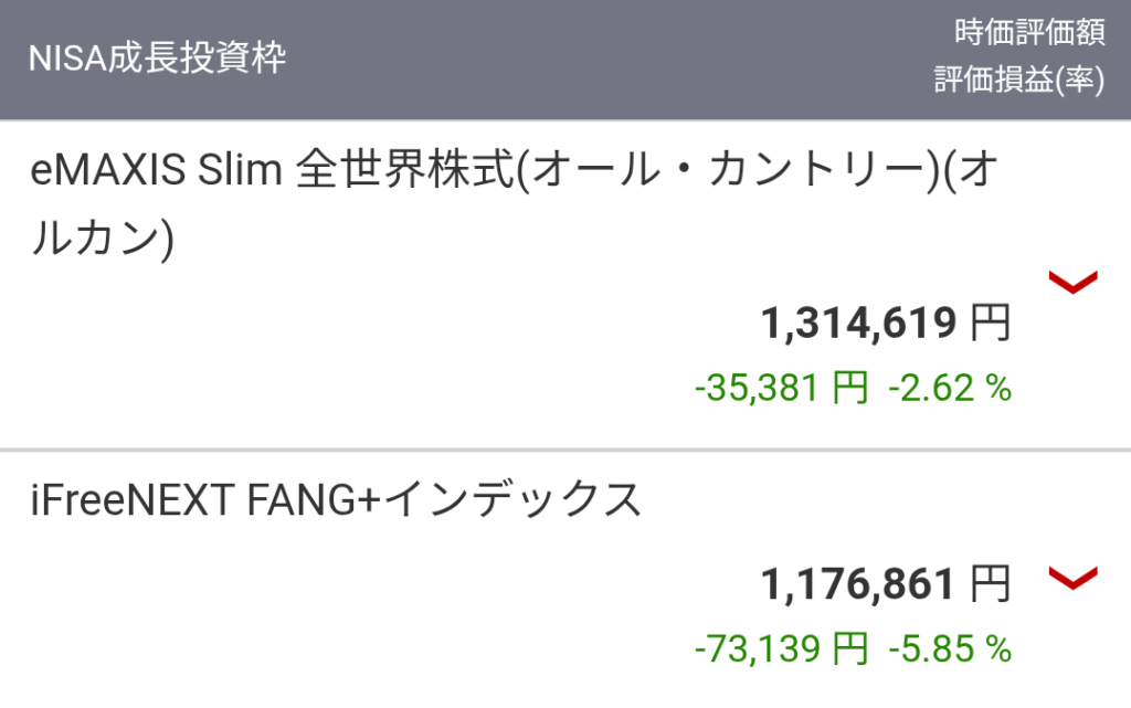 | 成長投資枠オルカン | 1,314,619円 | −35,381円 | −2.62% |